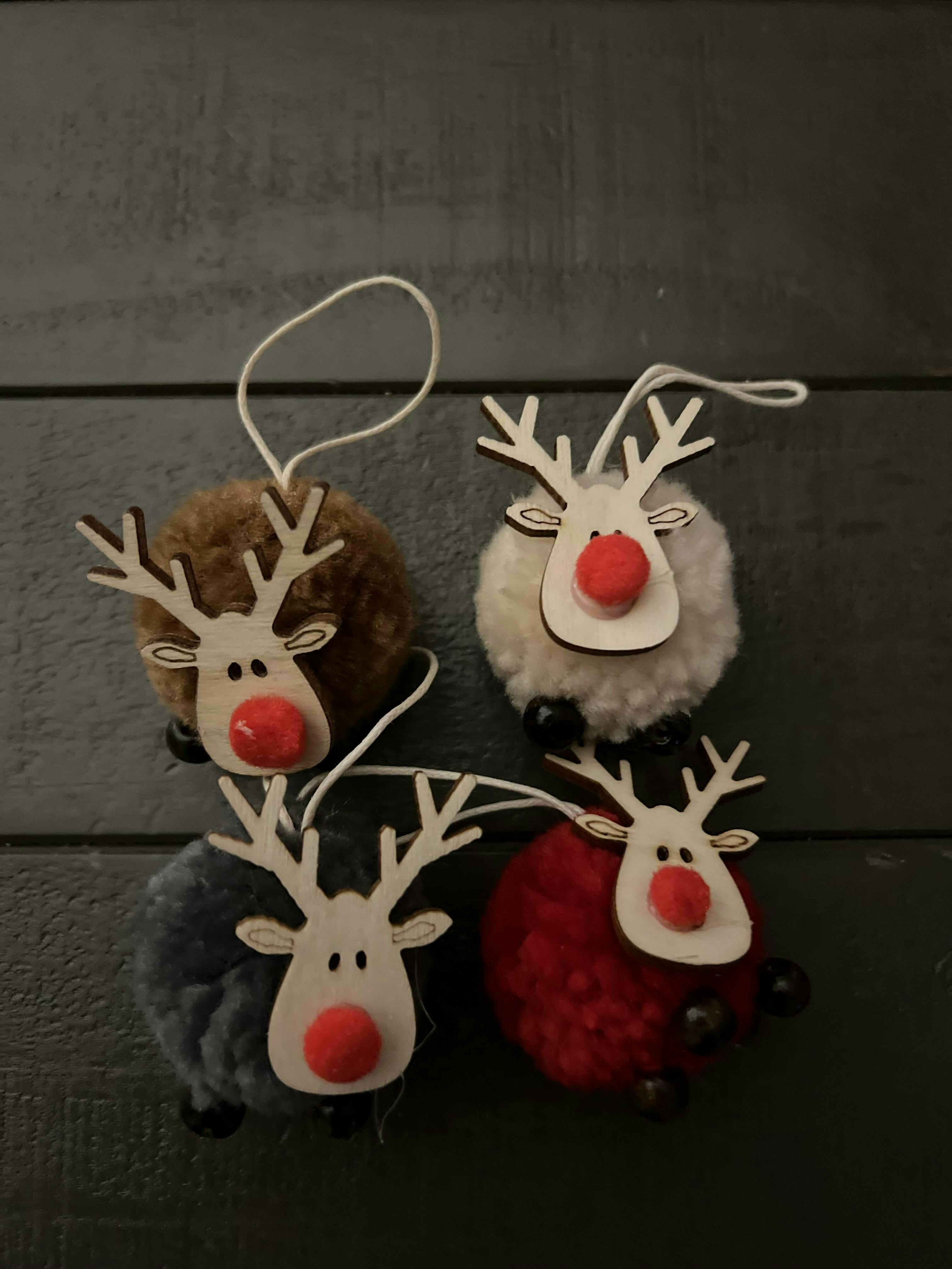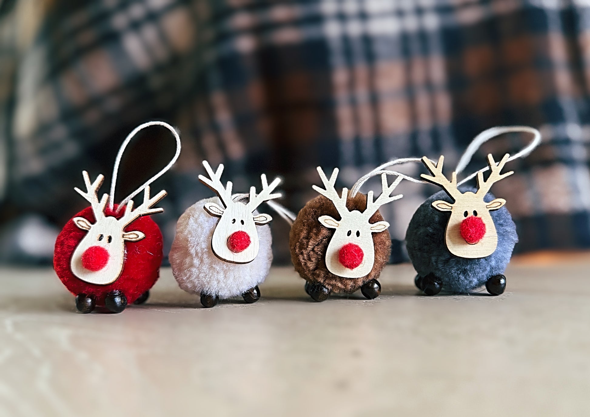 A little woodland whimsy for your tree. This set of four felt and wood reindeer ornaments comes in red, cream, gray, and brown—each finished with a soft pom pom and ready to hang. Cute, cozy, and instantly festive.