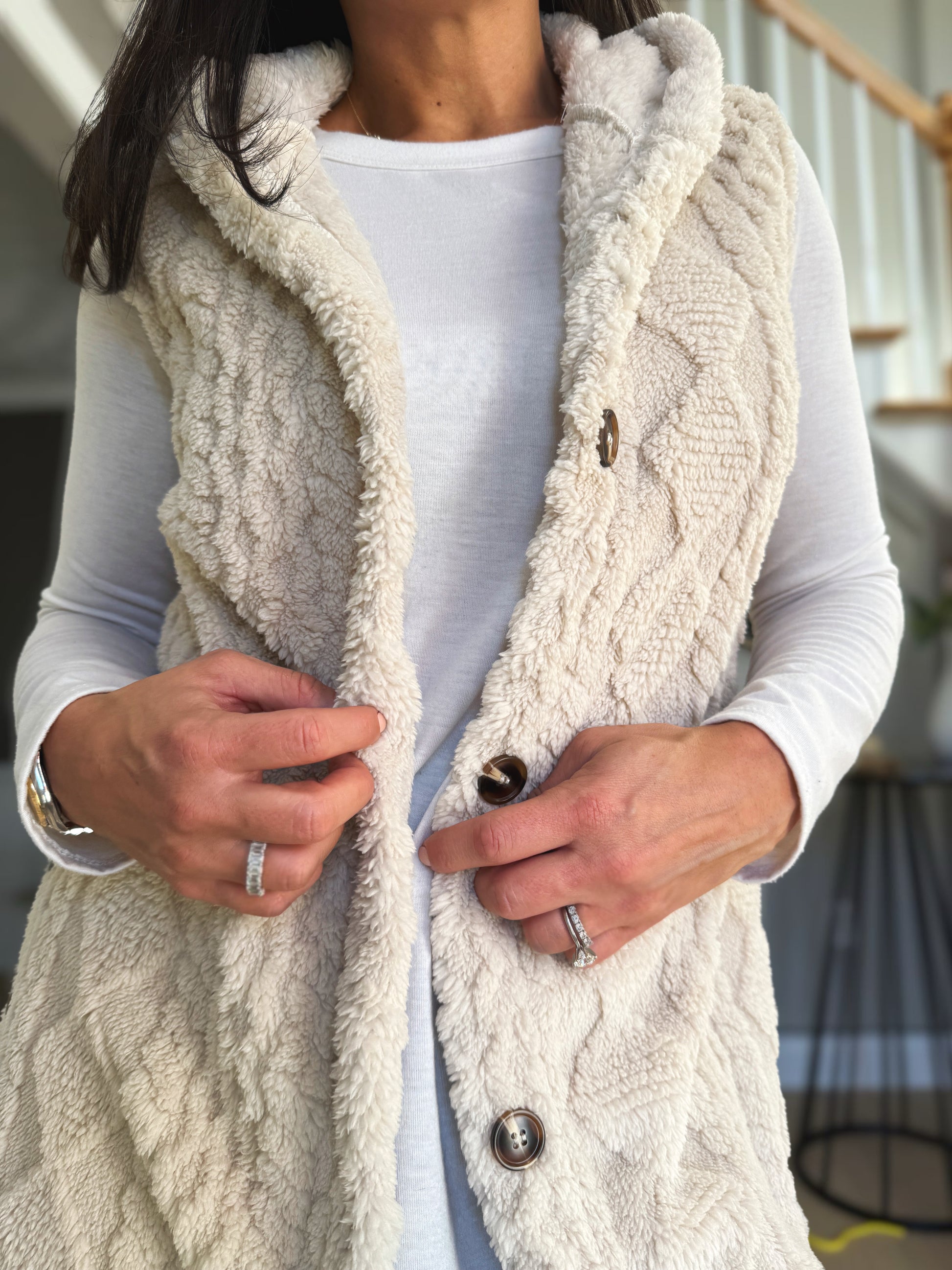 Wrap yourself in cloudlike comfort. This plush button-up hooded vest is like being swaddled in the softest blanket, perfect for layering over leggings for ultimate coziness or paired with jeans and booties for a chic daytime look.
